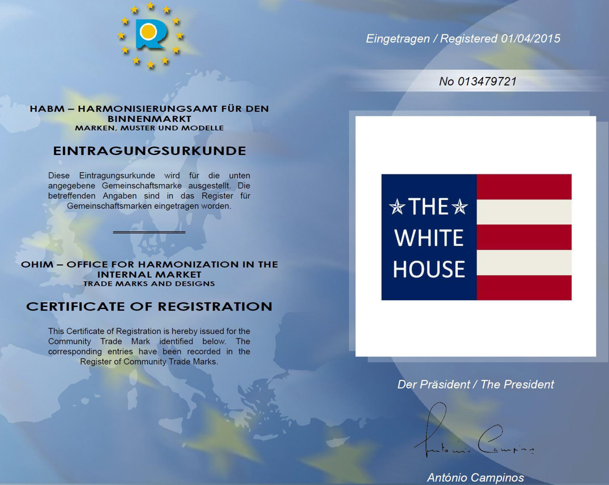 THE WHITE HOUSE GmbH ist als Bildmarke beim europäischen Patentamt registriert und geschützt.